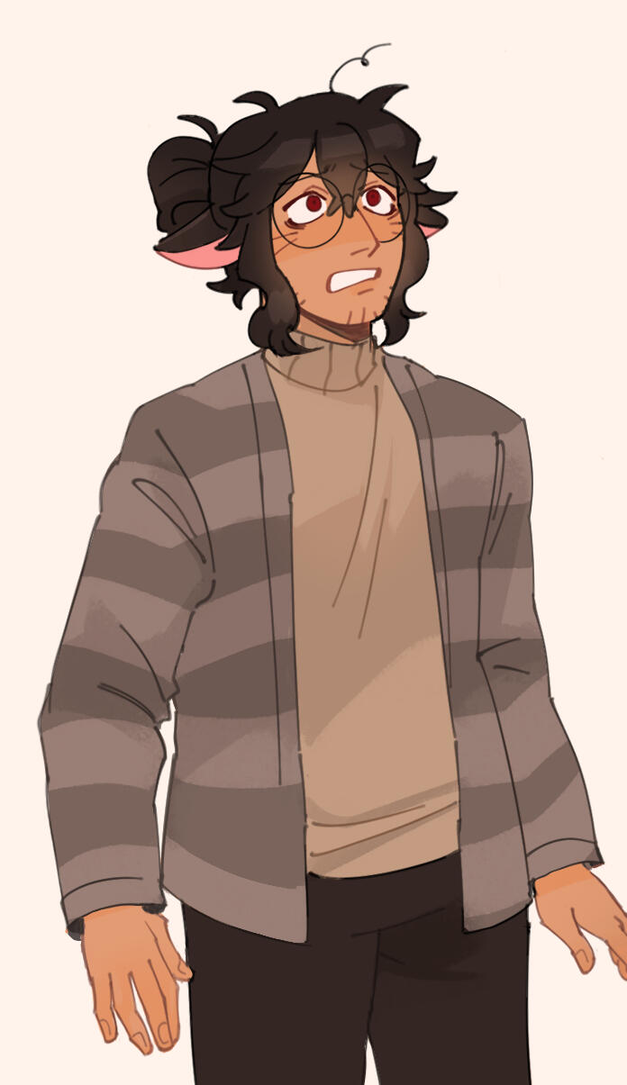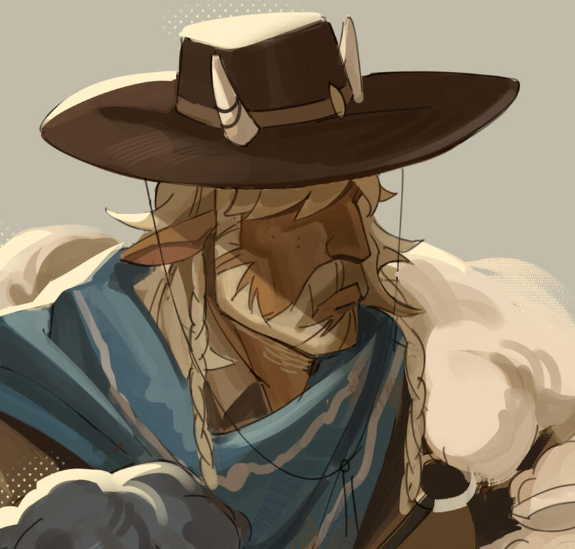 Among those who have met him, very few have been able to learn much about Shep. From afar, he is seen as intimidating due to his build and stoicism--often dwarfing others in terms of height. He appears to be emotionless, responding in one or two word answers on most occasions if at all. It’s difficult to parse what goes on in his head because of his subdued personality and lack of expression.Contrary to his stern appearance, Shep is a fairly friendly person. At least, he tries to be, despite his many failings at social interaction. As someone who prefers the company of sheep in the middle of nowhere, he has difficulty communicating with others. Because of this, he often ends up coming across as rude or uncaring, which is actually quite the opposite. His anxiety around saying the wrong things usually doesn't show in his demeanor, and his words of advice and encouragement can be seen as pointed insults. This has led to Shep's preference for isolation, finding comfort in the simplicity of sheep.Shep is quite the survivalist, enjoying all things nature. He finds something relaxing about making things with his hands, taking each day slowly and with gratitude. He partakes in hobbies such as gardening or hunting, sustaining himself off the land in many ways. He has a deep respect for nature and the circle of life, doing his best not to disrupt it. One of the few times he will express anger is when others do not respect other living beings.