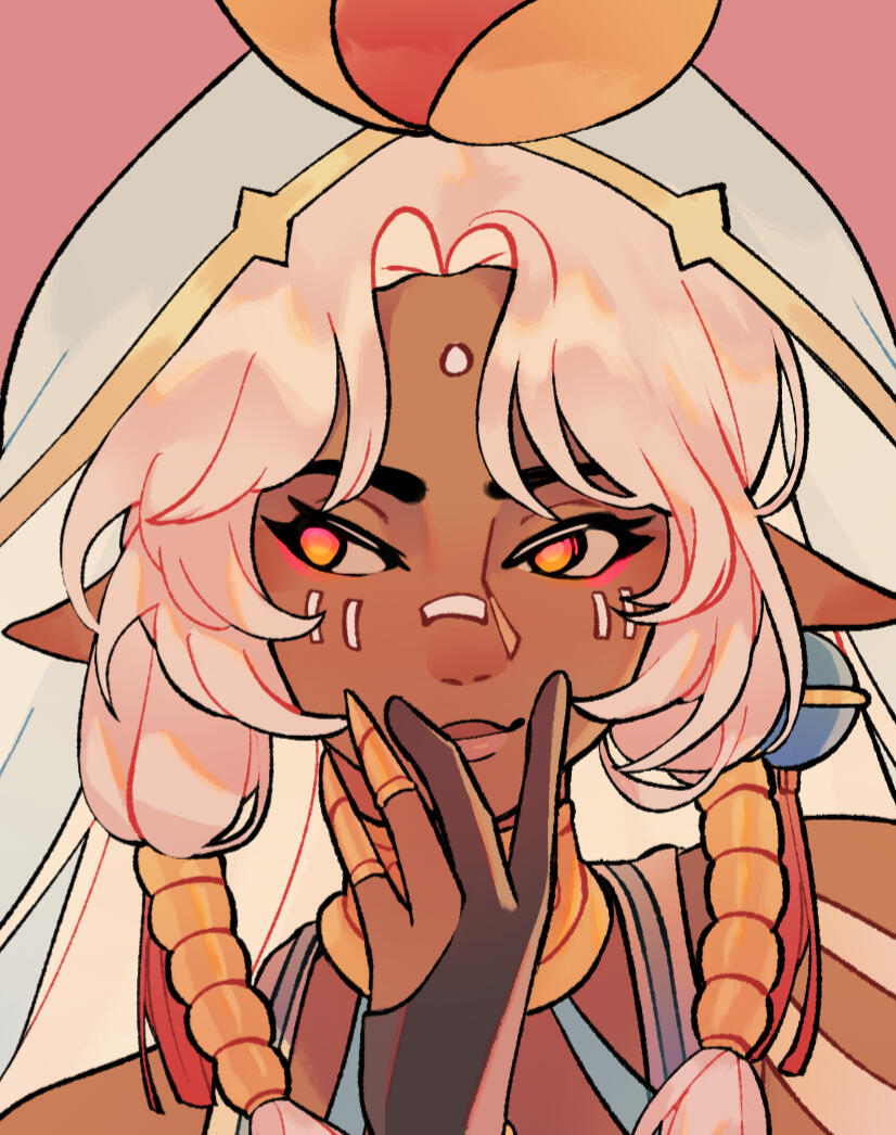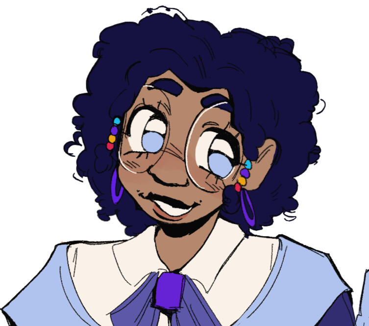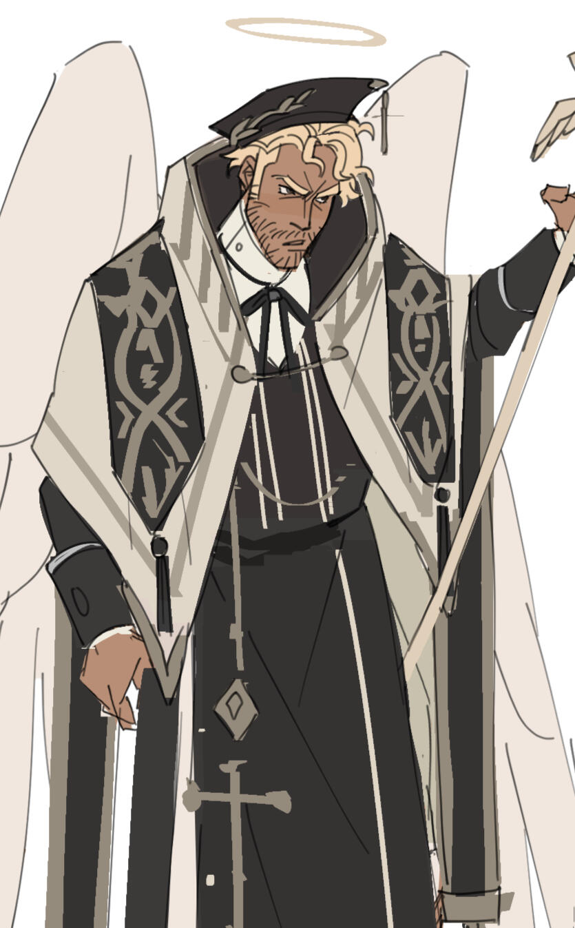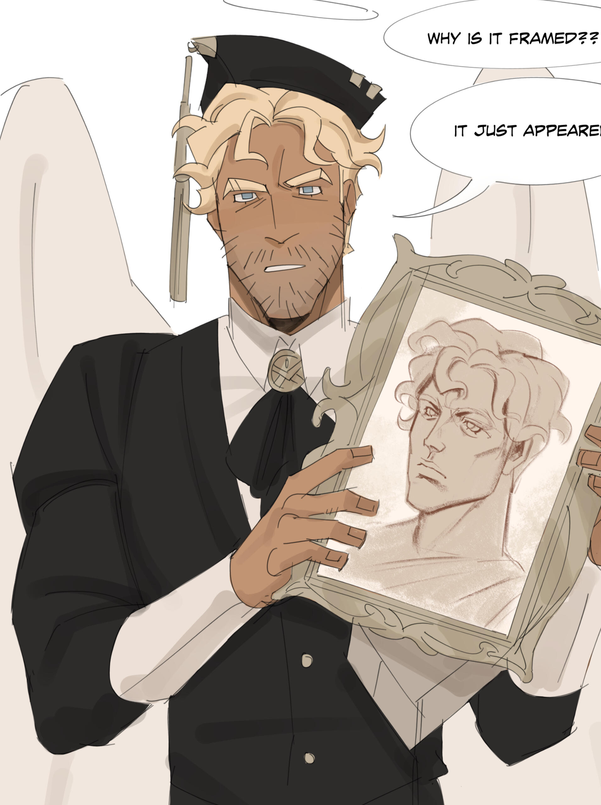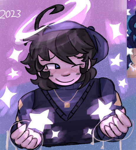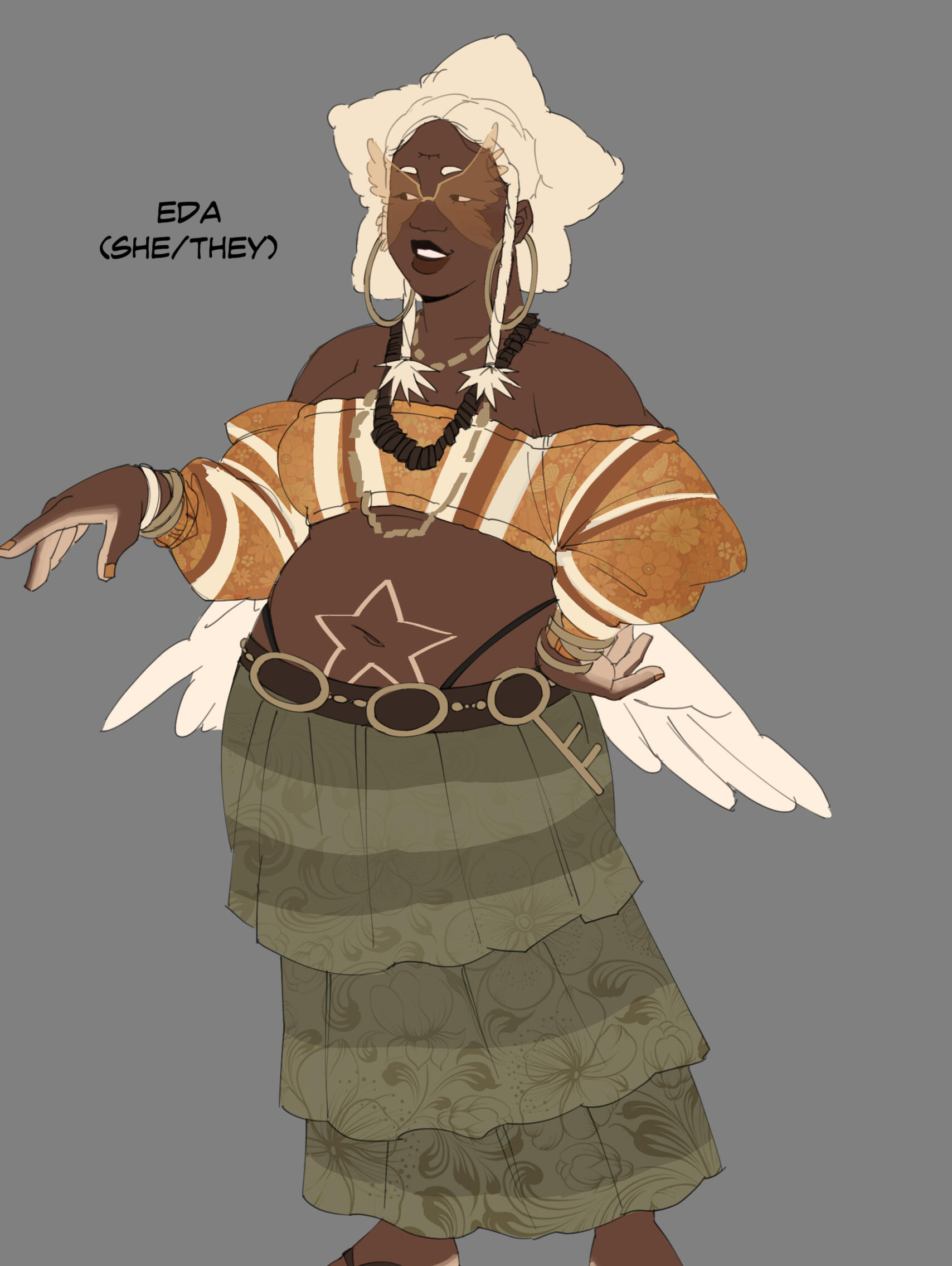 Working in the divine message division, Eda is meant to use her omnipotence for serious worldly matters. However, she seems to take a different approach to this. Eda would rather use her knowledge to seek out the latest office drama, either to add to it or just watch the trainwreck from afar. After many years of predicting catastrophic events, she finds personal matters to be much more interesting than some nebulous catastrophe.Eda herself is very easygoing, albiet nosy. She is usually a voice of reason in the workplace when she wants to be, but often prefers to watch how things play out on the sidelines. They are fascinated with how others without future knowledge act in their day-to-day lives, and thus does not disclose any visions they may have. This is also why they are interested in things such as astrology and tarot, finding enjoyment and charm in the ways others attempt to make sense of the world.Despite her propensity for helping perpetuate gossip, Eda is a reliable figure to talk to. Her calm demeanor makes it incredibly easy to share any problems with her. They may not be the most diligent angel, but still show the virtues one would have.