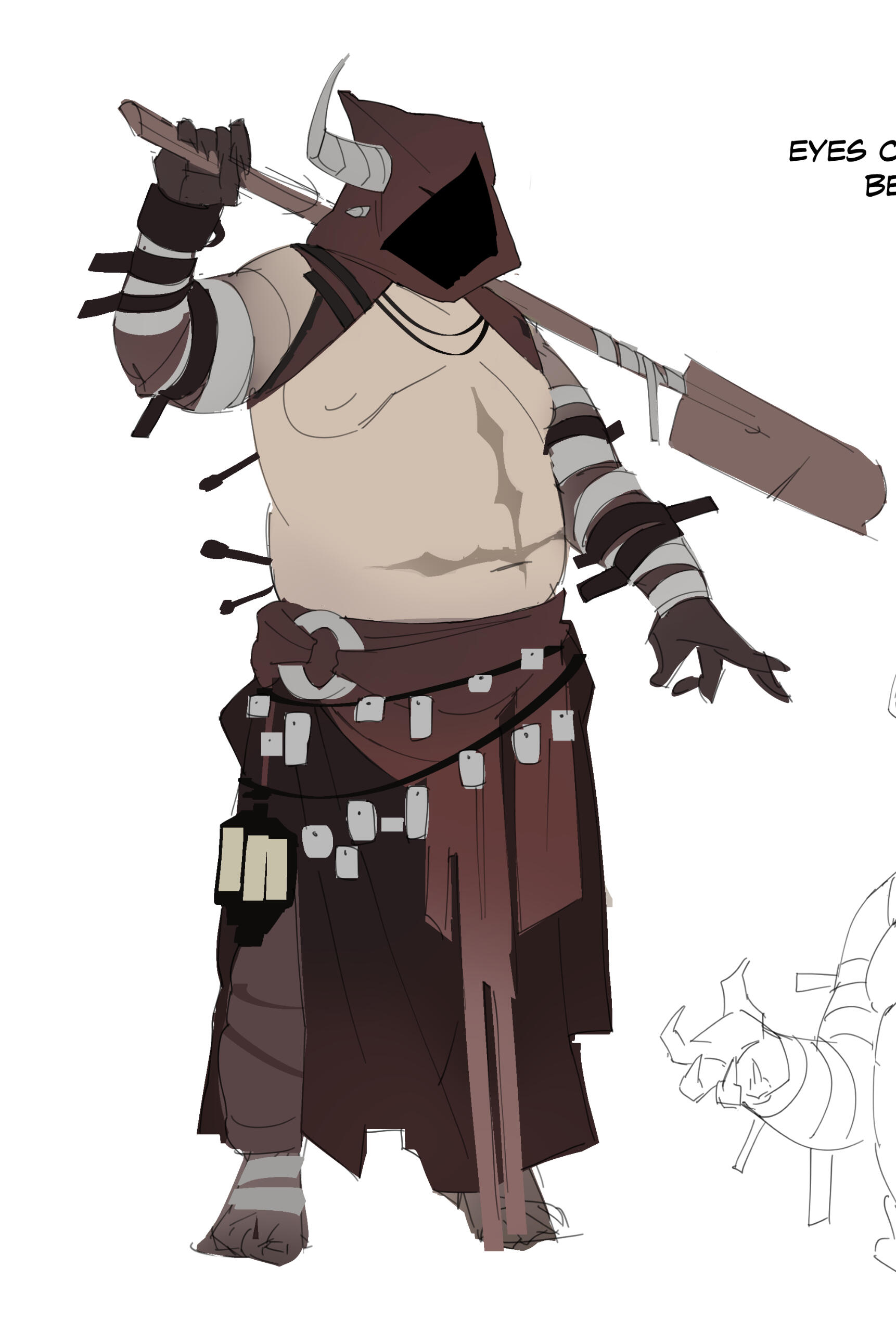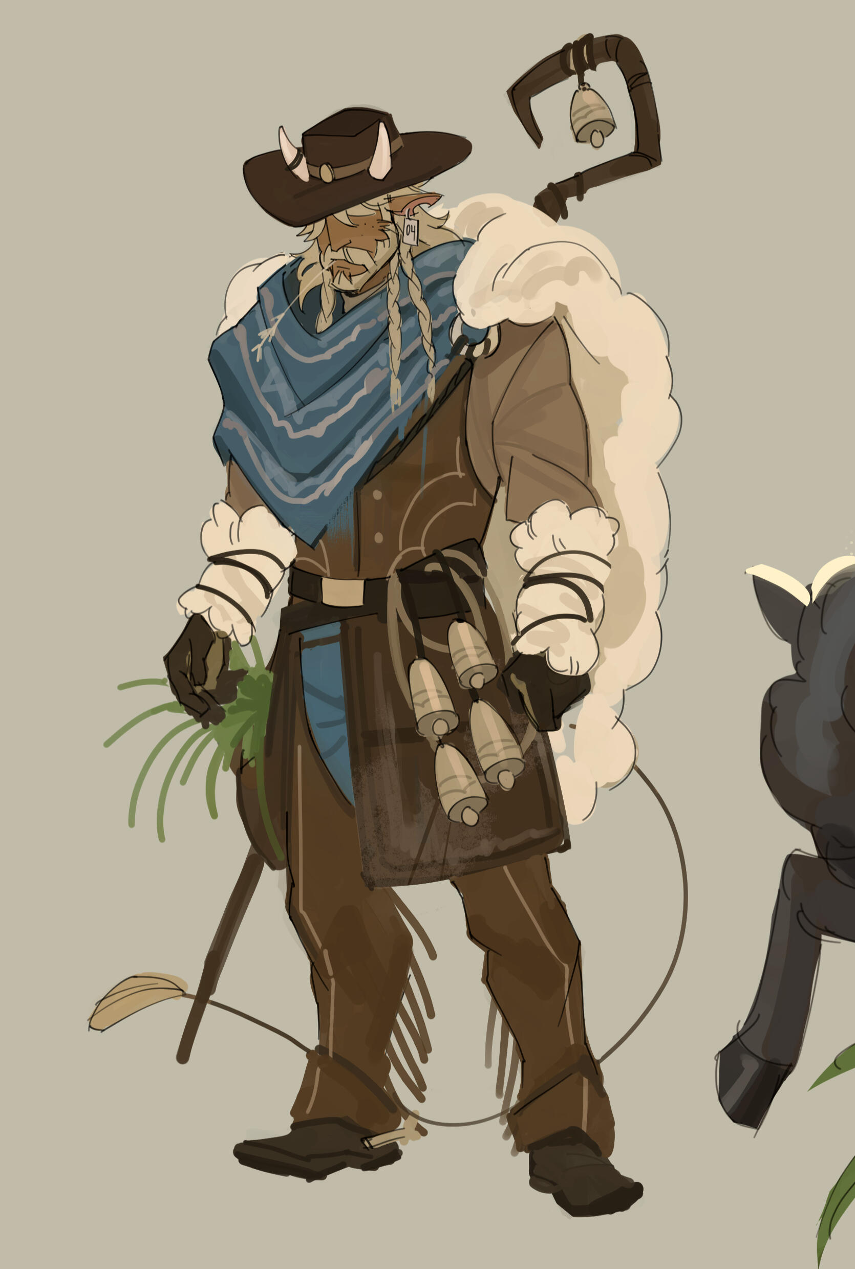 Among those who have met him, very few have been able to learn much about Shep. From afar, he is seen as intimidating due to his build and stoicism--often dwarfing others in terms of height. He appears to be emotionless, responding in one or two word answers on most occasions if at all. It’s difficult to parse what goes on in his head because of his subdued personality and lack of expression.Contrary to his stern appearance, Shep is a fairly friendly person. At least, he tries to be, despite his many failings at social interaction. As someone who prefers the company of sheep in the middle of nowhere, he has difficulty communicating with others. Because of this, he often ends up coming across as rude or uncaring, which is actually quite the opposite. His anxiety around saying the wrong things usually doesn't show in his demeanor, and his words of advice and encouragement can be seen as pointed insults. This has led to Shep's preference for isolation, finding comfort in the simplicity of sheep.Shep is quite the survivalist, enjoying all things nature. He finds something relaxing about making things with his hands, taking each day slowly and with gratitude. He partakes in hobbies such as gardening or hunting, sustaining himself off the land in many ways. He has a deep respect for nature and the circle of life, doing his best not to disrupt it. One of the few times he will express anger is when others do not respect other living beings.