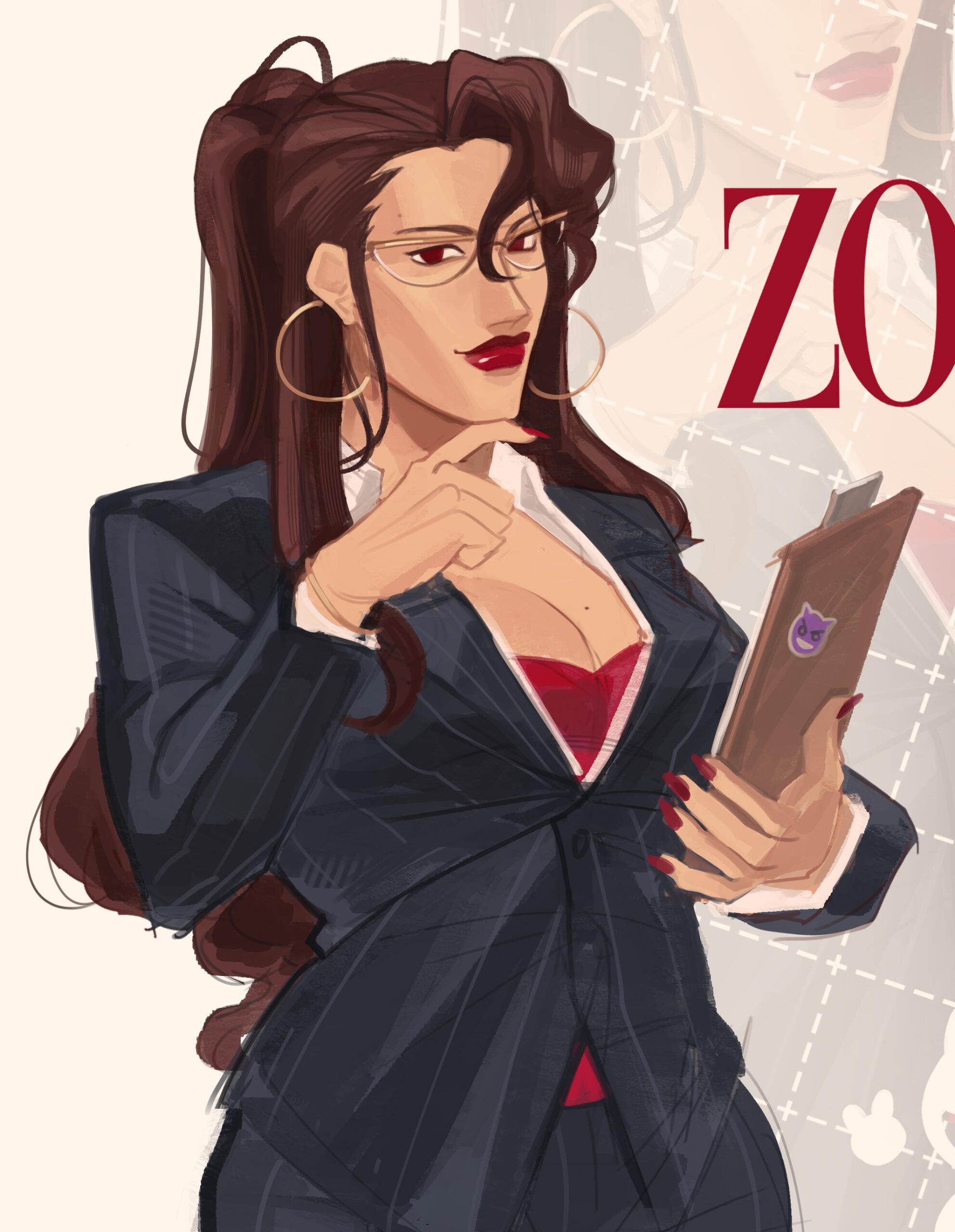 Zoru acts very motherly to those around her, enjoying being seen as a "big sister" type--likely due to her status as the youngest sibling among her family. She will usually dote on those around her, fussing over eating habits and making sure her colleagues are doing well. Zoru particularly enjoys speaking with more introverted people, feeling very protective over those who may not speak up for themselves. She hopes to be the kind of person that people see as comforting and put-together, able to speak with her about problems they may have.Before she took up the job as a secretary, Zoru was known to be quite wild in her youth. She was extremely irresponsible and reckless, and still maintains the somewhat-flirtatious attitude she had when she was younger. She has since given up the chaotic life she used to life, deciding to settle down and live a more conventional life. While she sometimes longs for the days of freedom and lack of responsibilities, she's ultimately satisfied with her choices.